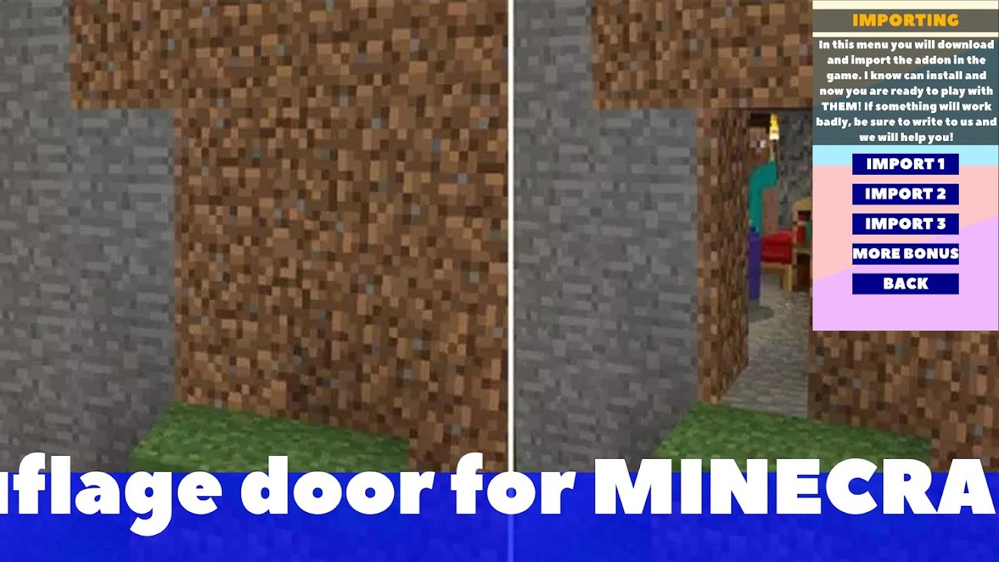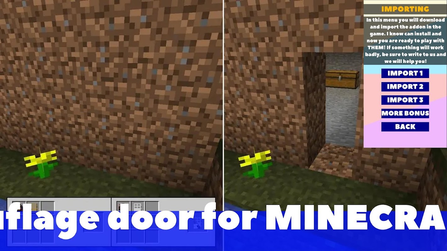 ❗ Camuflage Door Mod for Minecraft PE ❗ 😋 will add addon which contains variety of hidden doors to keep your valuables. It's better than lock doors because they can be hacked and camouflage doors are very hard to find. play witm them in the same world!😀