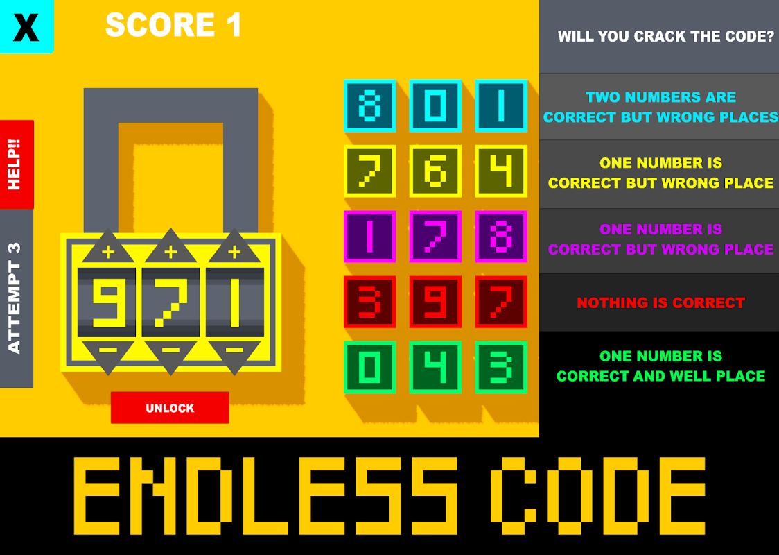 *कोड को क्रैक करें एक अंतहीन पहेली गेम है जो आपको 5 पहेलियों में से 3 सही नंबर खोजने की चुनौती देता है ताकि प्रत्येक कुंजी को अनलॉक किया जा सके और स्कोर प्राप्त किया जा सके!