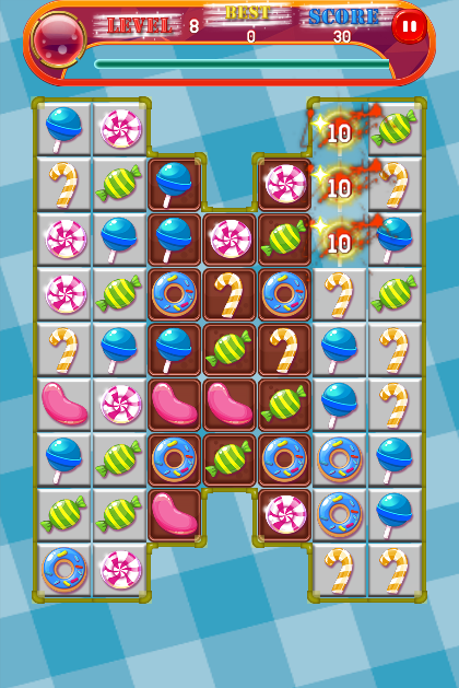 Get point by erasing Candy Bomb Matching . You can make longer chain of Candy Bomb Matching to get more points!