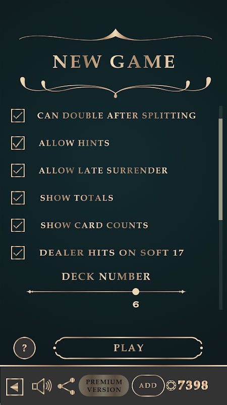 वास्तविक कैसीनो नियमों का अनुकरण करें: डेक की संख्या, शफल फ़्रीक्वेंसी, डीलर का व्यवहार, और बहुत कुछ। वास्तविक दुनिया की परिस्थितियों में कार्ड काउंटिंग रणनीतियों का अभ्यास करने के लिए बिल्कुल सही।