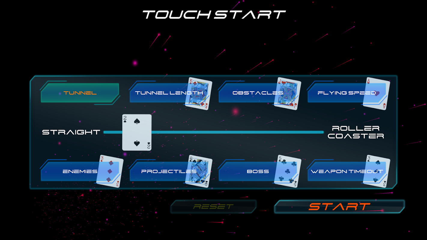 कोनामी के ग्रैडियस / सैलामैंडर से प्रेरित पूर्ण 3D स्पेस शूट-थेम-अप गेम। ताश के पत्तों से बनी रोलर-कोस्टर जैसी सुरंग से उड़ान भरें, विभिन्न दुश्मनों को नष्ट करें और अधिक शक्तिशाली हथियार प्राप्त करें। दुश्मनों के प्रकार और घनत्व, उड़ान की गति, सुरंग की लंबाई और टेढ़ेपन सहित कठिनाइयों का पूरी तरह से समायोज्य स्तर। एक बिल्कुल नए संदर्भ में स्पेस शूटर का अनुभव करें!~