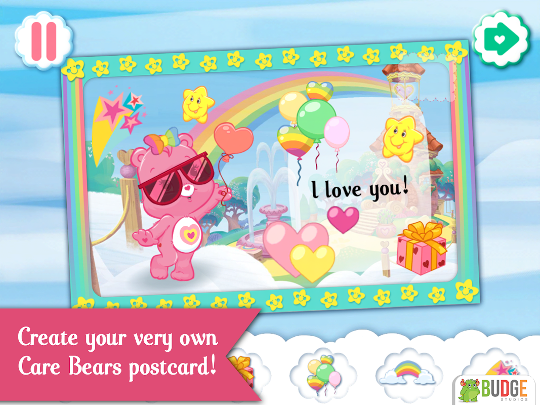 Budge Studios presents: Care Bears - Create & Share! Create your very own Care Bears postcard and share it with loved ones! Try out endless combinations of cuddly bears and rainbow-colored decorations for a different card every time. Then write a sweet message and send it with love – because sharing is caring!