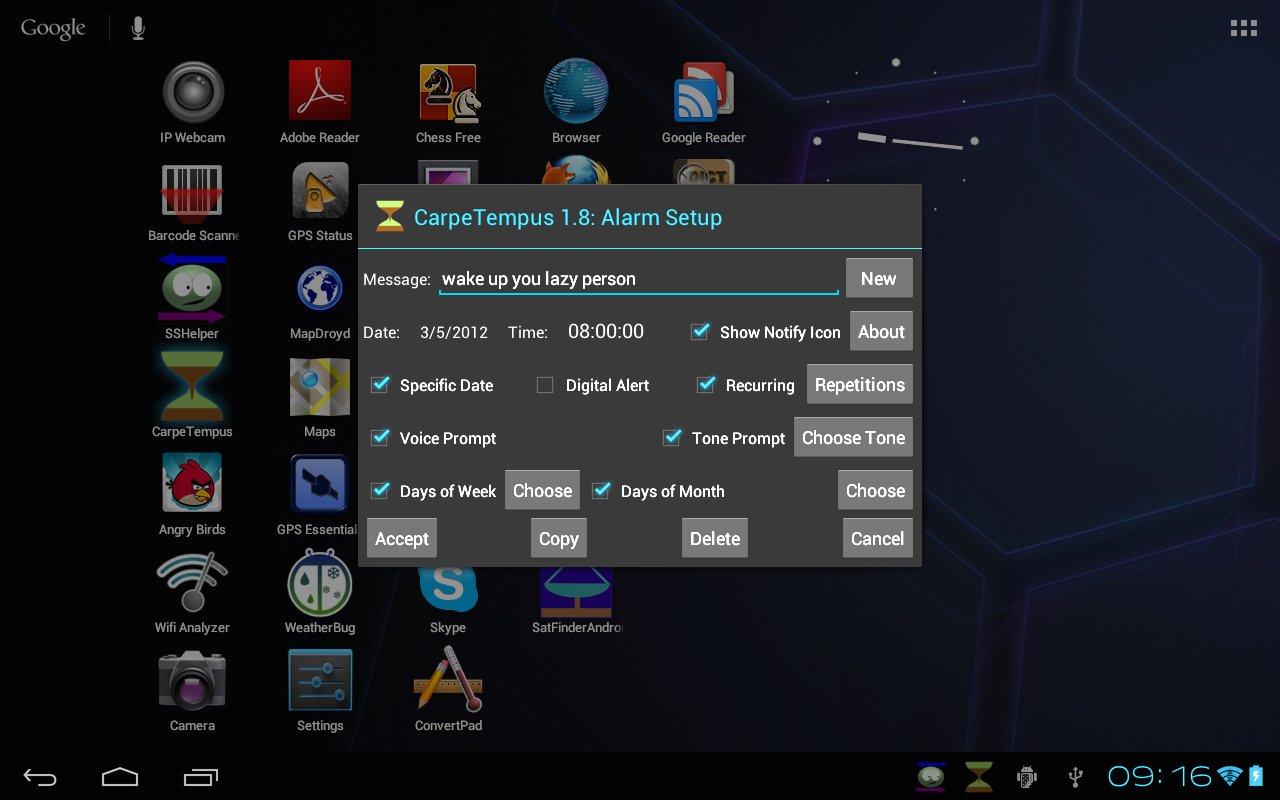 CarpeTempus अलार्म अनुसूचक बहुत परिष्कृत है - आप दिन का समय चुन सकते हैं, एक या एक से अधिक सप्ताह के दिन, महीने की एक या अधिक दिन या साल के एक विशेष दिन - या इनमें से किसी भी संयोजन.