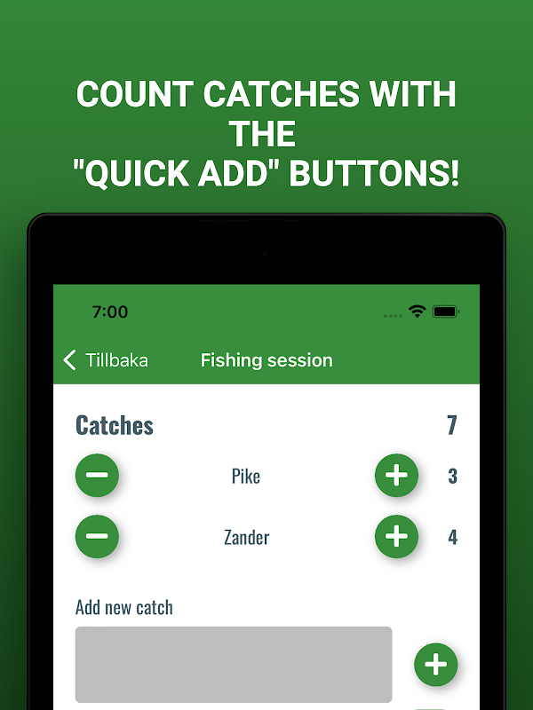 "फिशिंग सेशन" फीचर से आप आसानी से कैच की संख्या गिन सकते हैं, फोटो जोड़ सकते हैं या विशेष कैच रजिस्टर कर सकते हैं यदि आप उस मछली को पकड़ते हैं जिसके बारे में आप अधिक जानकारी सहेजना चाहते हैं।