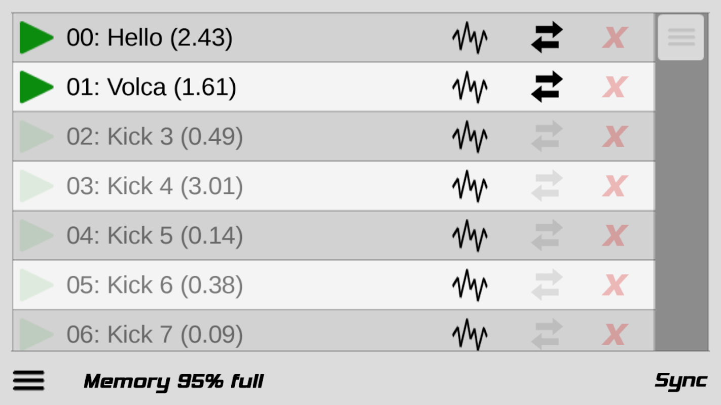 यह यह REJ Poirier / SingleCellSoftware KORG volca नमूना एसडीके का उपयोग करते हुए मेरे द्वारा किया जाता है, एक अधिकारी KORG app नहीं है।