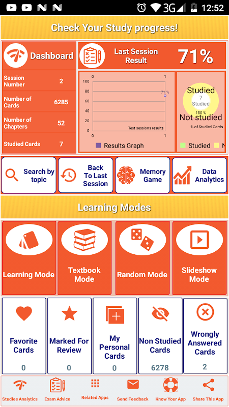 - 5 स्टडी मोड (लर्निंग मोड, टेस्टिंग मोड, हैंडआउट मोड, टेस्ट मोड, स्लाइड शो मोड और रैंडम मोड)।