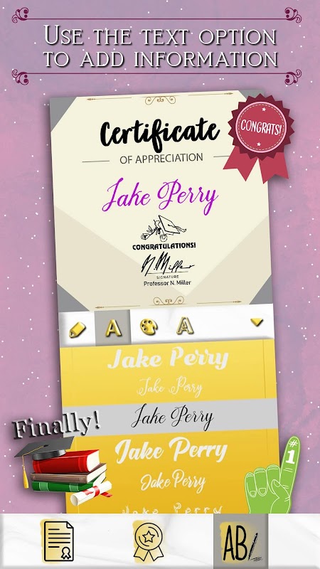 * प्रमाण पत्र पर पाठ लिखें और कई अद्भुत स्टिकर से चुनें जैसे कि स्नातक की उपाधि, किताबें और बहुत कुछ!