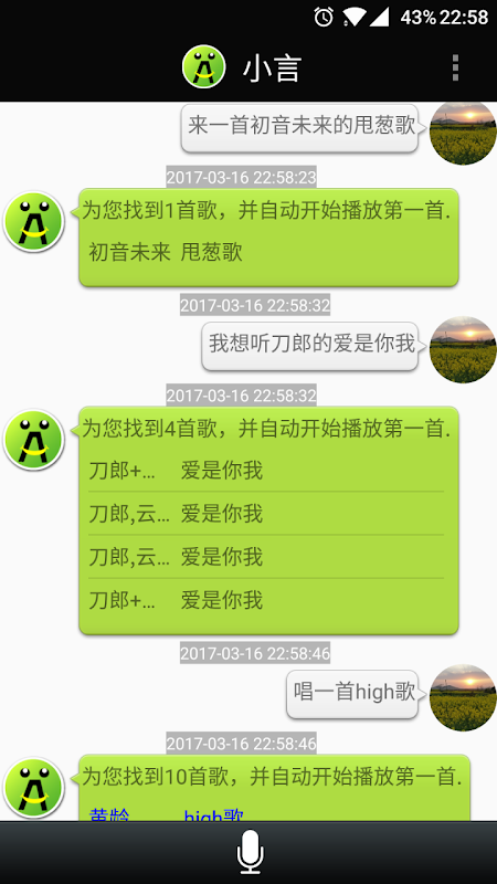 增加了语音识别功能,能识别三种语言:普通话、粤语、四川话。增加了放短歌功能,您可以使用"来一首谁谁谁的歌”、“我想听XXX歌”让软件播放音乐。修复了Bug。
