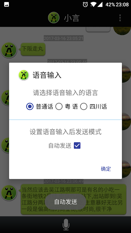 聊天机器人小言会讲笑话、讲故事、成语接龙、天气查询、智能对话、数学计算、简单英语翻译、脑筋急转弯等;可以改变发音音色,会说四川话、广东话、东北话、湖南话、陕西话、河南话等六种方言;您可以选择您爱听的方言;
