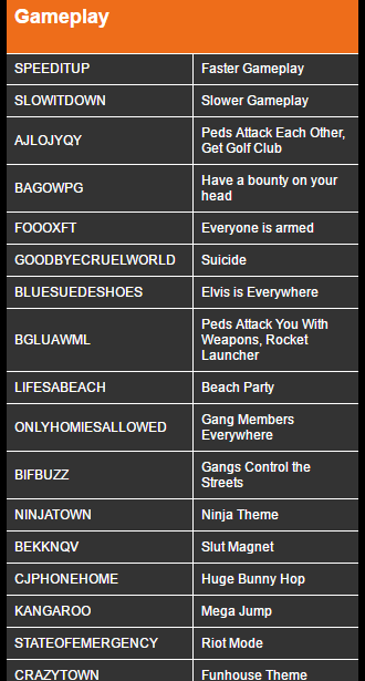 Cheat Code for GTA SanAndreas