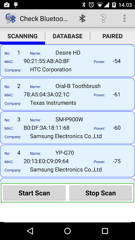 बनती मैक पते RSSI शक्ति ब्लूटूथ जानकारी नाम डेटाबेस उपकरणों की जांच