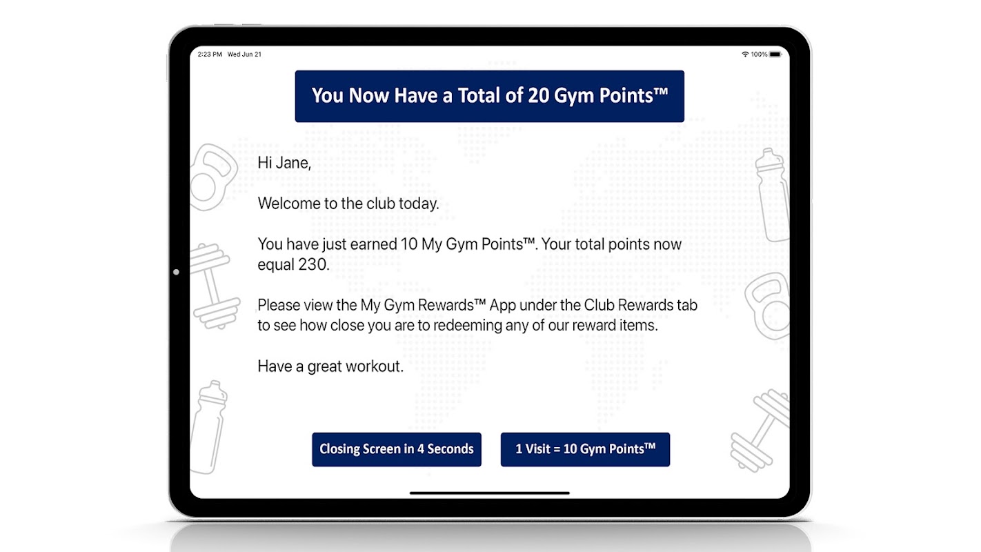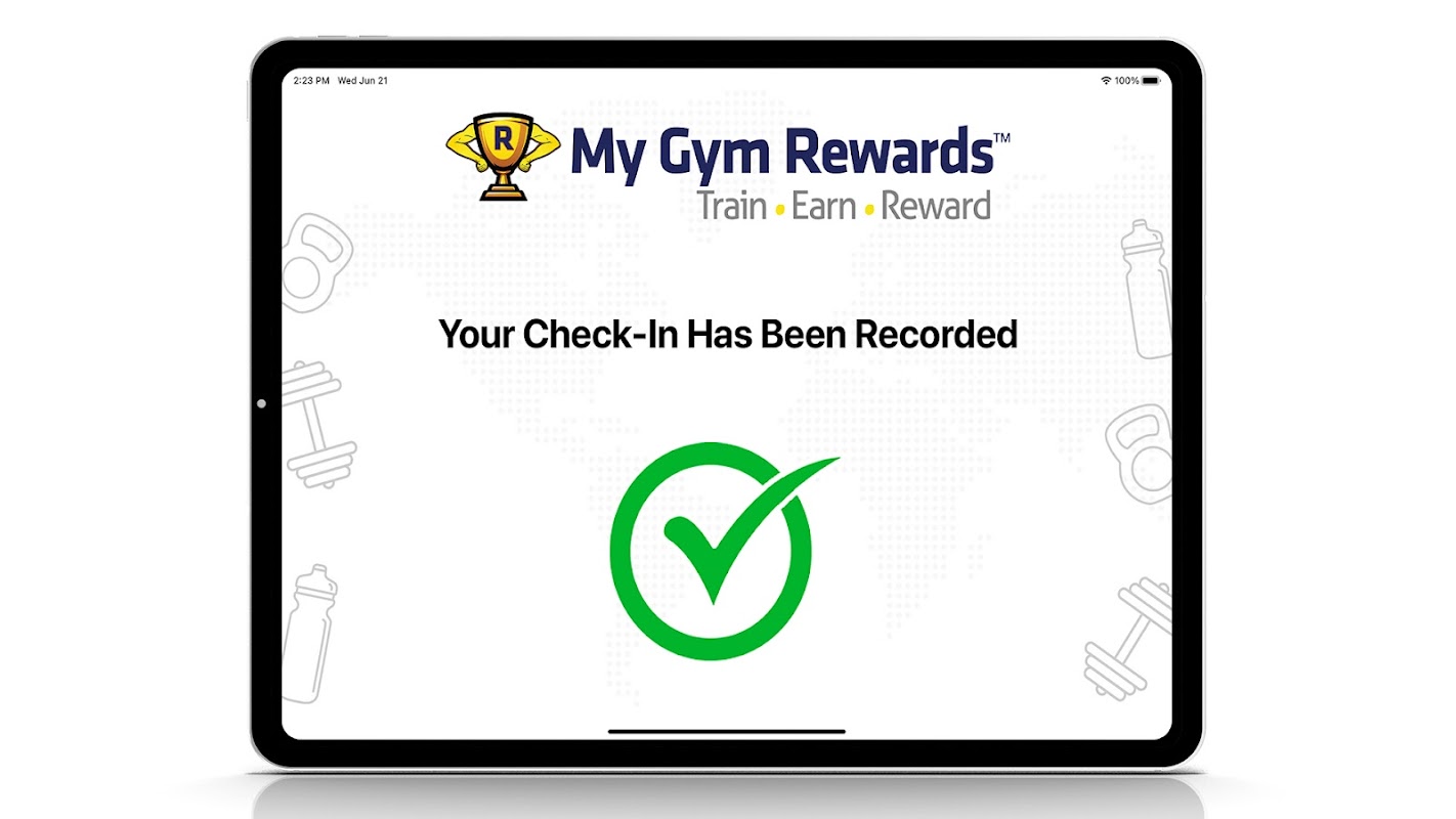 माई जिम रिवार्ड्स™ चेक-इन ऐप, माई जिम रिवार्ड्स™ फोन ऐप के उपयोगकर्ताओं को जिम या फिटनेस सुविधा में प्रवेश करते समय अपने क्यूआर कोड को स्कैन करने की अनुमति देता है, जिसमें माई जिम रिवार्ड्स™ लॉयल्टी और रिवॉर्ड प्रोग्राम उनकी सुविधा के माध्यम से चल रहा है। यह स्कैन सदस्य को चेक-इन जिम पॉइंट अर्जित करने की अनुमति देता है, उदाहरण के लिए। प्रति क्लब चेक-इन 10 अंक। इसके बाद सदस्य अपने संचित जिम पॉइंट्स को क्लब आइटम और सेवाओं (पुरस्कारों) के लिए भुना सकते हैं, जैसे कि क्लब मर्चेंडाइज, सप्लीमेंट्स, मुफ्त प्रशिक्षण सप्ताह, मुफ्त इन-क्लब वाउचर और यहां तक कि परिवार और दोस्तों के लिए मुफ्त सदस्यता (1 माह)।
