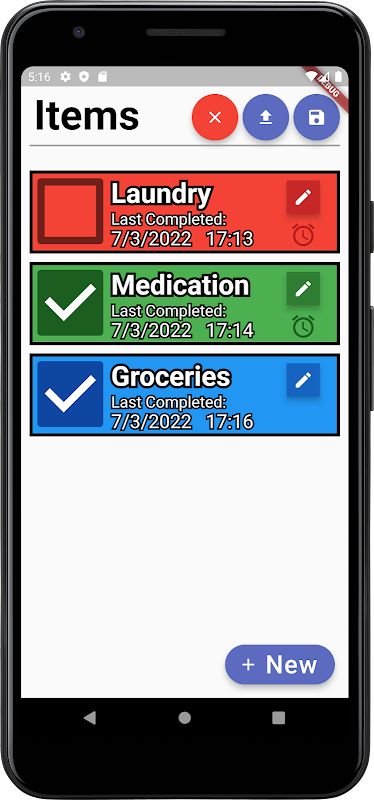 नियमित आधार पर (दैनिक, साप्ताहिक, आदि) की जाने वाली गतिविधियों पर नज़र रखने के लिए एक सरल डिजिटल चेकलिस्ट। यह अलार्म को रिमाइंडर के रूप में भी सेट कर सकता है, और इसमें प्रत्येक आइटम के लिए बुनियादी अनुकूलन सुविधाएँ हैं।