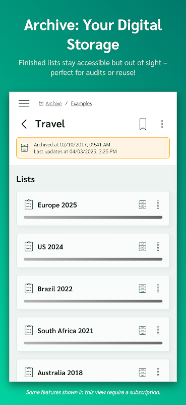 पुनः उपयोग करने योग्य टेम्पलेट - टेम्पलेट को तुरंत चेकलिस्ट में बदलें। आवर्ती कार्यों (जैसे, निरीक्षण, खरीदारी, या वर्कफ़्लो) के लिए आदर्श।