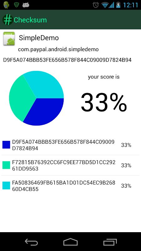Since such checksums are not available, the database is constantly being builded up and improved thanks to users' contributions: each user, by simply using this app, automagically submits his apps checksums, which, in turn, are checked with other values submitted by other users: a final "report" drawn up according to the "statistic diffusion" of hashes lets this application show, for each featured app, a value of "goodness" that is to say how many users have the same hash of yours!