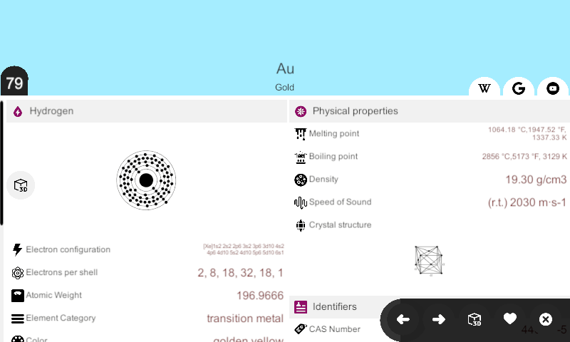 मौलिक विन्यास और 3डी परमाणु परत चार्ट, केमटेबल तत्वों के इलेक्ट्रॉन विन्यास को गतिशील 3डी चार्ट के रूप में देखने की क्षमता प्रदान करता है। यह विज़ुअल मॉडल उपयोगकर्ताओं को परमाणु संरचना को बेहतर ढंग से समझने में मदद करता है, खासकर इलेक्ट्रॉन परतें कैसे व्यवस्थित होती हैं। 3डी मॉडल एनिमेटेड गतिविधियों के साथ आते हैं, जो एक सहज और आकर्षक सीखने का अनुभव प्रदान करते हैं।