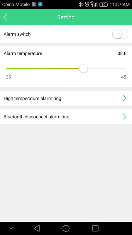 आप अपने अलार्म तापमान सेट कर सकते हैं। आप अलार्म तापमान आप द्वारा निर्धारित से अधिक है, एपीपी याद दिलाने रखेंगे (फोन जब तक आप अलार्म बंद बज रखेंगे) अब यह निकाल रहा है, तो आप समय पर विरोधी बुखार उपायों ले जा सकते हैं
