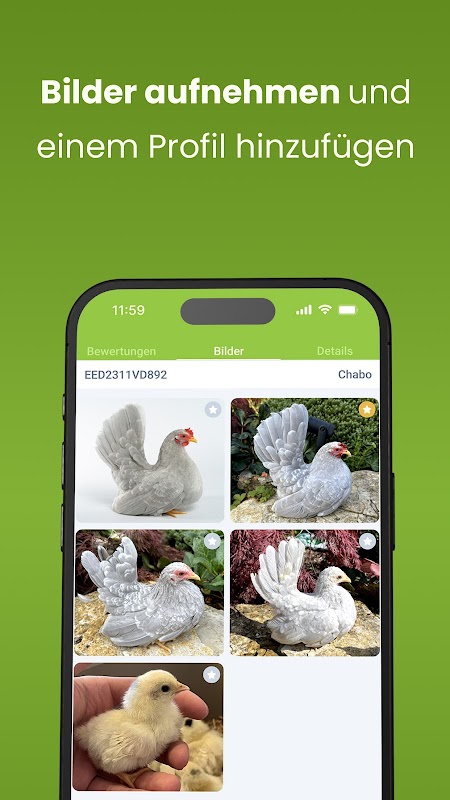 चिकन प्रोफाइल: अपने प्रत्येक मुर्गे के लिए एक विस्तृत प्रोफ़ाइल बनाएं - चित्र, नोट्स, रिंग नंबर, जन्म तिथि, लिंग, ब्रीडर और अन्य महत्वपूर्ण जानकारी के साथ। बिक्री और मृत्यु डेटा भी प्रबंधित करें।