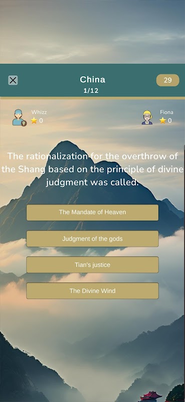 "चाइना टेस्ट क्विज़" के साथ, आप दुनिया के सबसे अधिक आबादी वाले देश के बारे में आकर्षक सामान्य ज्ञान में गहराई से उतरेंगे, रोमांचक मल्टीप्लेयर शोडाउन में प्रतिस्पर्धा करते हुए जानकारी के छिपे हुए रत्नों को उजागर करेंगे. प्राचीन राजवंशों, आधुनिक नवाचारों, प्रतिष्ठित स्थलों, स्वादिष्ट व्यंजनों, पारंपरिक त्योहारों और बहुत कुछ सहित विषयों की एक विविध श्रृंखला का अन्वेषण करें.