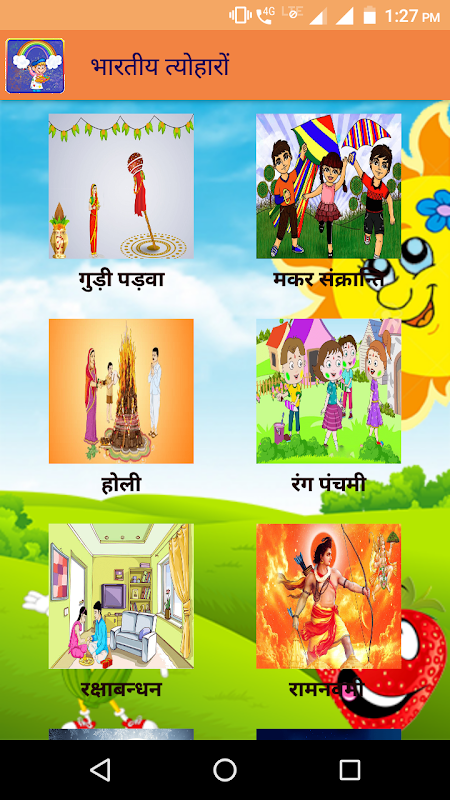 इस ऐप में सभी प्रकार के जानवर, पक्षी, फूल, फल, कार्टून छवियां शामिल हैं ताकि आप विभिन्न रंगों वाली छवियों को रंग दे सकें।अंतिम दो आइकन "चित्रकला प्रतियोगिताएं विषय" और "त्यौहार" में क्रमशः सभी प्रतियोगिता विषयों और सभी भारतीय त्यौहार शामिल हैं, जिन्हें अक्सर चित्रकला प्रतियोगिता में कहा जाता है और इससे बच्चों के लिए ड्राइंग सीखने का आसान तरीका होता है|
