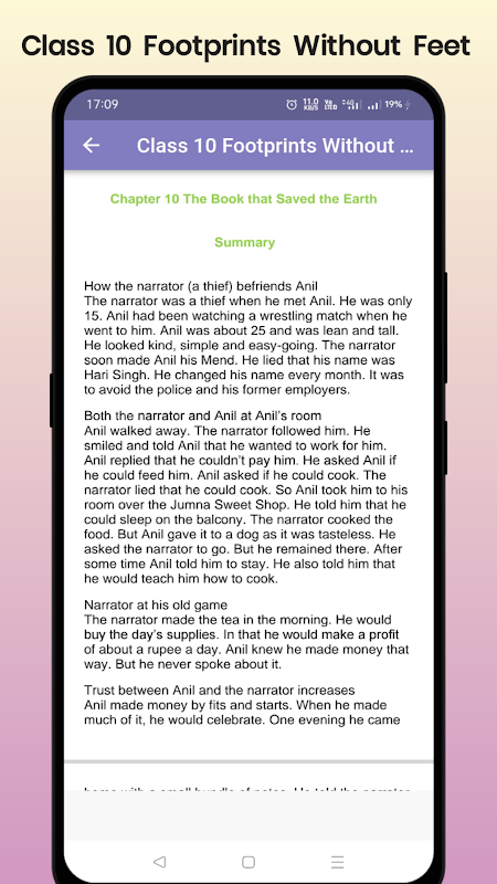 This application contains class 10 Footprints without feet English NCERT Solutions Chapter wise with summary and question & answers. This application contain 10 chapter of class 10 english textbook. I think this app is must have app for class 10 student.