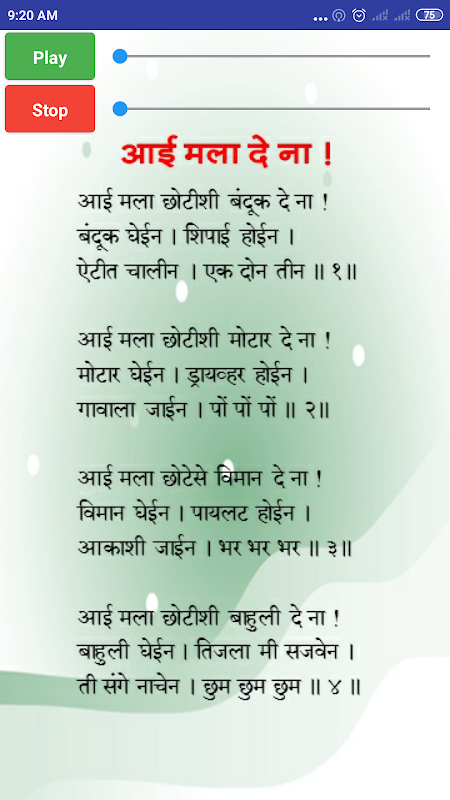 कक्षा एक मराठी पाठ्यपुस्तक की सभी कविताएं मेरी आवाज में दर्ज की गई हैं। उचित संगीत भी है।