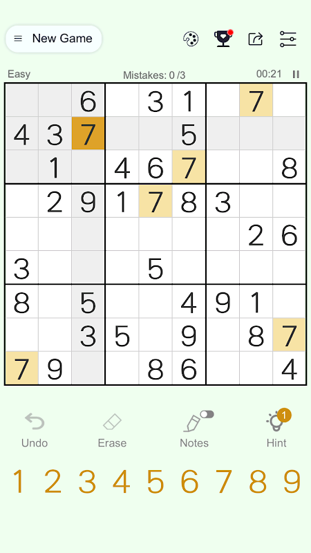 कई सुडोकू गेम सेटिंग्स को आपकी गेम शैली के अनुसार अनुकूलित किया जा सकता है (इस्तेमाल किए गए नंबरों को छिपाएं, अद्वितीय नंबरों को हाइलाइट करें, समान नंबरों को हाइलाइट करें, क्षेत्रों को हाइलाइट करें या त्रुटियों को फेंकें। स्वचालित पुनर्प्राप्ति)।