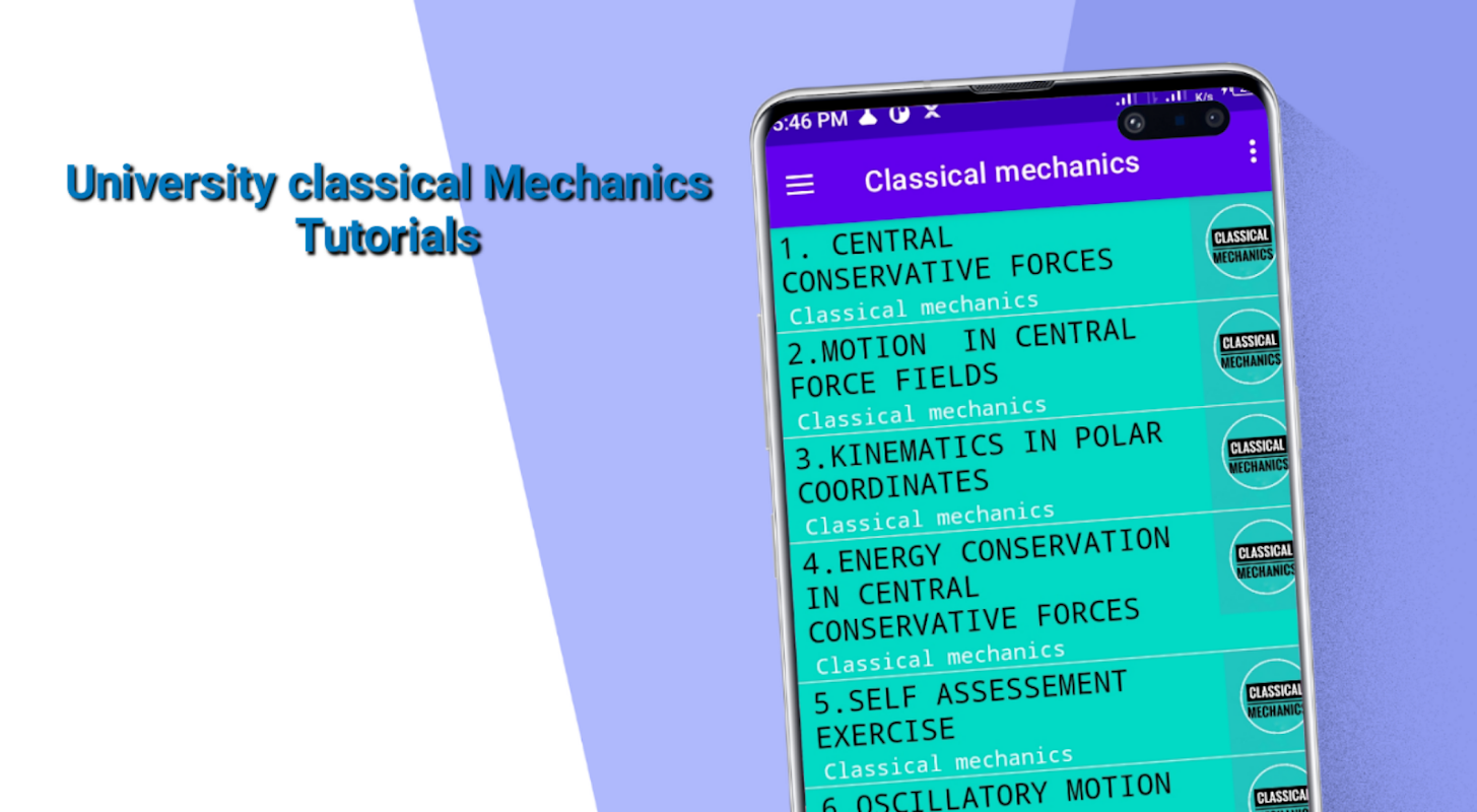 The application features classical mechanics notes plus self assessment exercises from the following topics