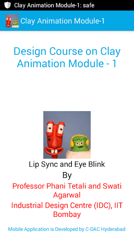 एप्लिकेशन को क्ले एनीमेशन पर डिजाइन पाठ्यक्रम की सामग्री का उपयोग करने के लिए इस्तेमाल किया जा सकता मॉड्यूल-1