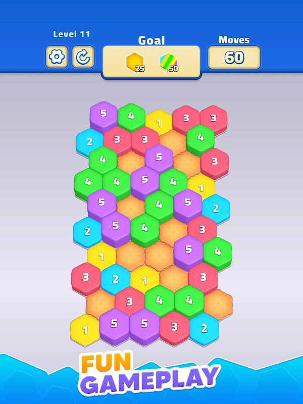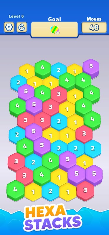 Click Up Hexa Stack में लक्ष्य साफ़ करने के लिए टाइलों को मर्ज करें, अपग्रेड करें, और ब्लास्ट करें!