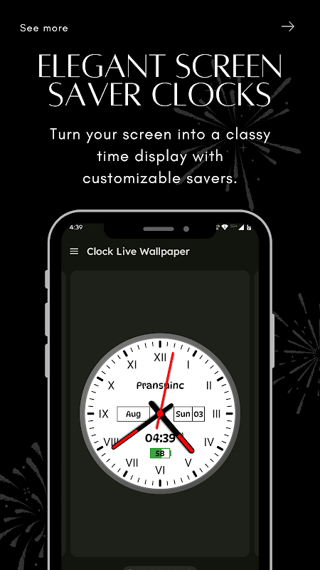 हमारे ऐप से, आप एनालॉग से लेकर डिजिटल तक, घड़ी शैलियों की एक विस्तृत श्रृंखला में से चुन सकते हैं, और आसानी से उन्हें अपने लाइव वॉलपेपर या स्क्रीन सेवर के रूप में सेट कर सकते हैं। ऐप में आपकी नई घड़ी से मेल खाने के लिए कस्टम वॉलपेपर का एक संग्रह भी है, जो आपके डिवाइस को पूर्ण और सामंजस्यपूर्ण लुक देता है।