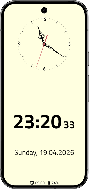 फुलस्क्रीन एनालॉग- और इवेंट व्यू के साथ डिजिटल क्लॉक