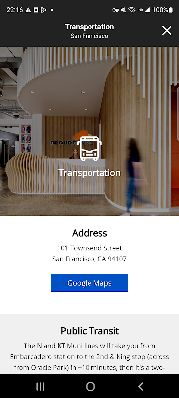 क्लाउडफ्लेयर वर्कप्लेस ऑनसाइट जानकारी तक आसानी से पहुंचने और क्लाउडफ्लेयर कैंपस में आपकी यात्रा की योजना बनाने के लिए हमारा वन-स्टॉप-ऐप अनुभव है।