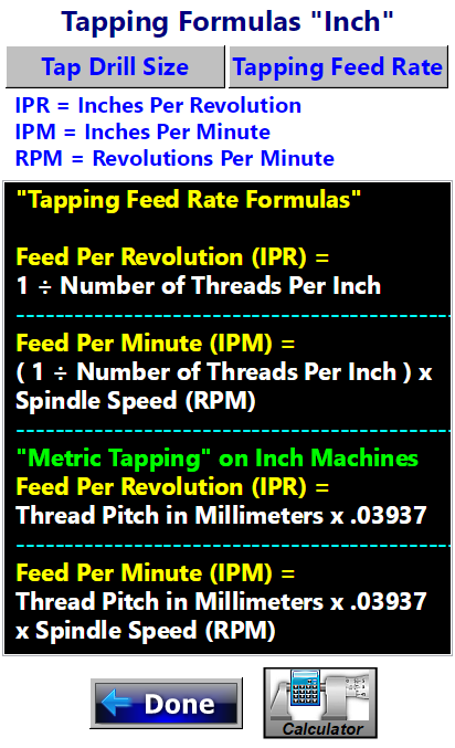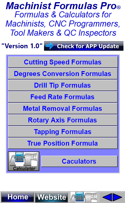 Formulas & Calculators for Machinists, CNC Programmers,Tool Makers, Metalworking Engineers, Machinist Apprentices, Conventional Machinists, Manual Machinists, Hobby Machinists, Machine Shops, CNC Turning, CNC Milling, CNC Mill Operators, CNC Lathe Operators, CNC Mill Set-Up, CNC Lathe Set-Up, Machine Shop Inspection, Compound Sine Plate Set-Up. Cutting Speed Formulas, Angles & Degrees Formulas, Drill Tip Formulas, Feed Rate Formulas, Metal Removal Formulas, Rotary Axis Formulas, Tapping Formulas, True Position Formula. Formulas include: Surface Feet per Minute SFM, Surface Meters per Minute SMPM, Revolutions per Minute RPM, Degrees to Radians, Radians to Degrees, Decimal to Degrees, Degrees to Decimal, Sharp Drill Tip Length Formulas, Flat Drill Tip Length Formulas, Feed Rate Formulas & Calculators: Inches per Minute, Inches per Revolution, Inches per Tooth, Millimeters per Minute, Millimeters per Revolution, Millimeters per Tooth, Inches per Minute to Millimeters per Minute, Inches per Minute to Inches per Revolution, Inches per Minute to Inches per Tooth, Inches per Revolution to Inches per Minute, Inches per Revolution to Inches per Tooth, Inches per Revolution to Millimeters per Revolution, Inches per Tooth to Inches per Minute, Inches per Tooth to Inches per Revolution, Inches per Tooth to Millimeters per Tooth, Millimeters per Minute to Inches per Minute, Millimeters per Revolution to Inches per Revolution, Millimeters per Tooth to Inches per Tooth. Metal Removal Formulas & Calculators: Time Cutting in Minutes TCM, Time Cutting in Seconds TCS, Distance over Time in Minutes, Metal Removal Rate MRR. Rotary Axis Formulas & Calculators : Inches per Minute to Degrees per Minute, Millimeters per Minute to Degrees per Minute, Degrees per Minute to Inches per Minute, Degrees per Minute to Millimeters per Minute. Tapping Formulas & Calculators: Tapping Feed Rate in Inches per Revolution, Tapping Feed Rate in Millimeters per Revolution, Tapping Feed Rate in Inches per Minute, Tapping Feed Rate in Millimeters per Minute, Tapping Feed Rate for Inch Taps on a Metric Machine, Tapping Feed Rate for Metric Taps on a Inch Machine, Tap Drill Size Formula for Inch Cutting Taps, Tap Drill Size Formula for Inch Roll Form Taps, Tap Drill Size Formula for Metric Cutting Taps, Tap Drill Size Formula for Metric Roll Form Taps. Inspection Formulas: Sine Plate Set-Up Formula & Calculator, Compound Sine Plate Set-Up Formula & Calculator, True Position Formulas & Calculator with or without Maximum Material Condition MMC