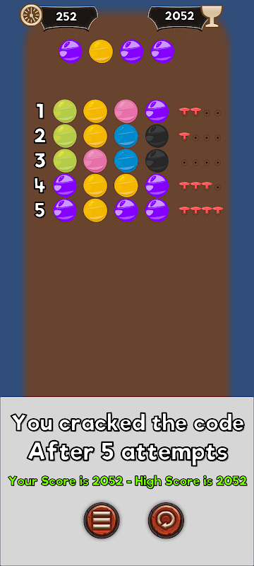 In the spirit of the classic game from the 1970's, in CodeBreaker, the goal is to figure out the hidden color code. Depending on your difficulty setting, the code can be either 4 or 5 colors.