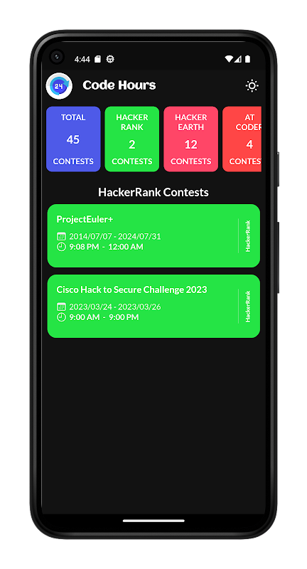CodeHours एक ऐसा ऐप है जो आपको सभी कोडिंग चुनौतियों और प्रतियोगिताओं और HackerRank, HackerEarth, Codeforces, CodeChef, LeetCode, Google Kickstart, AtCoder, आदि जैसे कोडिंग प्लेटफॉर्म पर आयोजित प्रतिस्पर्धी प्रोग्रामिंग प्रतियोगिताओं पर नज़र रखने की अनुमति देता है। यह ऐप आपको अपडेट रखता है "कैलेंडर में ईवेंट जोड़ें" 🗓️ की क्षमता के साथ चल रही और आने वाली सभी प्रतियोगिताएं।