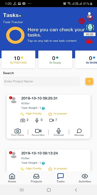 - Create tasks under the particular project with different information like Task name , Attachments with Screenshot , Screen Recording , Audio Recording , Set Task Priority , Image Selection.