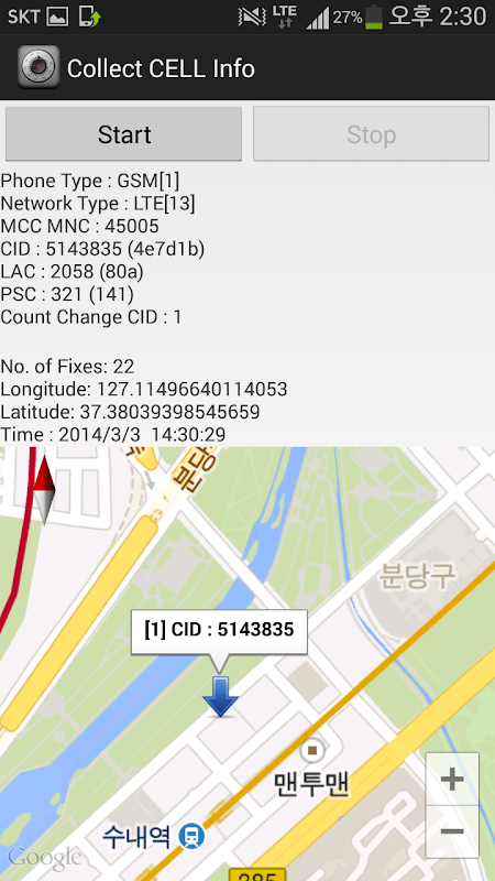 GPS 위치측위가 가능한순간부터 기지국 정보(Cell ID)가 변화하는 시점에 Cell ID와 당시의 GPS측위된