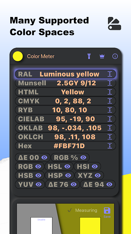 जो चीज़ कलर मीटर को अन्य ऐप्स से अलग करती है, वह श्वेत पत्र संदर्भ का इसका अभिनव उपयोग है। परिवेशीय प्रकाश के रंग और तीव्रता की भरपाई (स्वचालित अंशांकन) करके, कलर मीटर यह सुनिश्चित करता है कि रंग माप अधिक सटीक और विश्वसनीय हैं। यह आपकी जेब में एक पेशेवर मीटर रखने जैसा है।