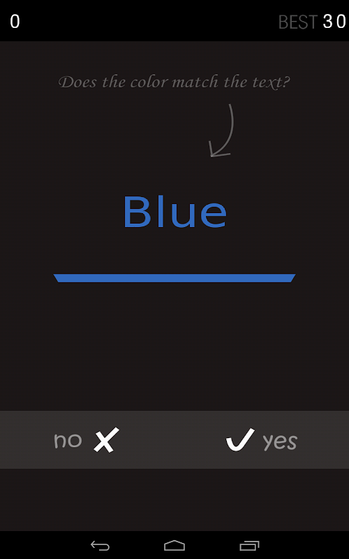 Does the color match the text? You should make the right choice based on what you see in a short time. Be careful when the color not match the text.Believe me, this game will drive you crazy and you just cant stop playing it.Try to see where is your best!