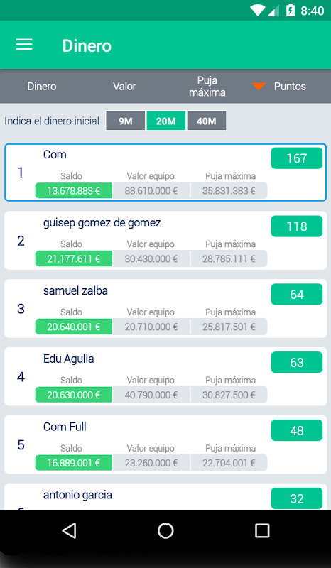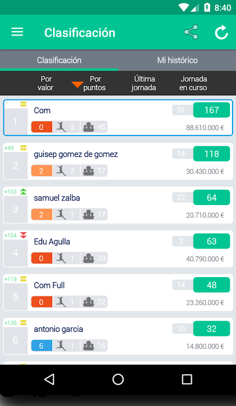 ● Ver estadísticas de cada futbolista, últimos puntos, puntos de la temporada, valores de mercado, así como estadísticas de la liga.