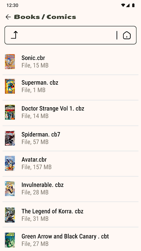 एप्लिकेशन में, आप डिवाइस पर फ़ाइल निर्देशिका का उपयोग करके देखने के लिए दस्तावेज़ों को जोड़कर उनके साथ काम कर सकते हैं। एप्लिकेशन के दस्तावेज़ कैटलॉग में एक फ़ाइल जोड़ने के बाद, आप अपनी पसंदीदा कॉमिक्स, पत्रिकाओं या पुस्तकों का नाम बदल सकते हैं, हटा सकते हैं और साझा कर सकते हैं, साथ ही नाम से कॉमिक खोजने के लिए अंतर्निहित खोज का उपयोग कर सकते हैं।