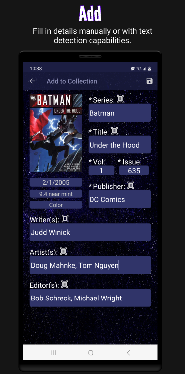 एक कॉमिक बुक से एक बिलियन तक - अपने कॉमिक बुक संग्रह को सीधे अपने डिवाइस से व्यवस्थित, स्टोर और साझा करें! OCR (इमेज टू टेक्स्ट) क्षमताओं की विशेषता, अपने संग्रह की सूची में कॉमिक बुक को जोड़ना आसान और सुविधाजनक बनाता है। शीर्षकों, श्रृंखलाओं, संस्करणों, अंक संख्याओं, लेखकों, और बहुत कुछ पर नज़र रखें!