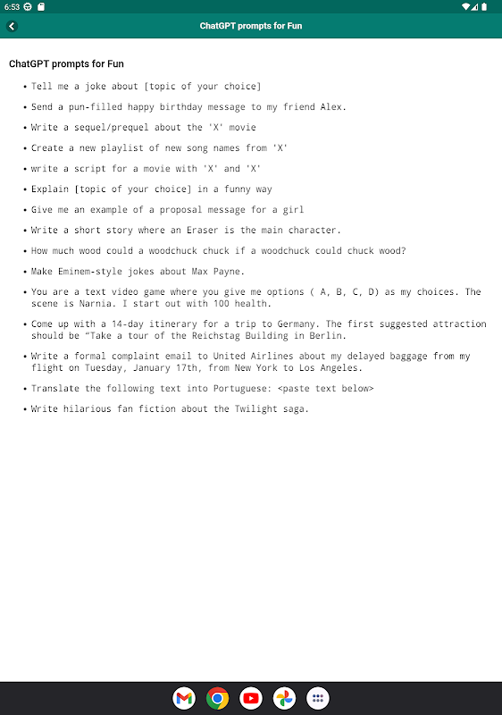 कृत्रिम बुद्धिमत्ता की असीमित क्षमता की खोज करें और सीखें कि एआई का प्रभावी ढंग से उपयोग कैसे करें। इस ऐप में, आपको अपने दैनिक उपयोग के लिए चैटजीपीटी की एक व्यापक कमांड प्रॉम्प्ट सूची मिलेगी। चाहे आप एक छात्र, शिक्षक, उद्यमी, फ्रीलांसर, स्टार्टअप, लघु व्यवसाय, डिजिटल मार्केटर या सामग्री निर्माता हों, यह ऐप आपको प्रॉम्प्ट इंजीनियरिंग के बारे में अपना कौशल बढ़ाने में मदद करेगा।