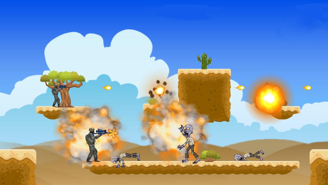 A brave commando runs and collects power-ups and use them to fight zombies in this desert action run and gun. Endless enemy obstacle challenges allows you to play on and on. Fight as far as you can to get high score.