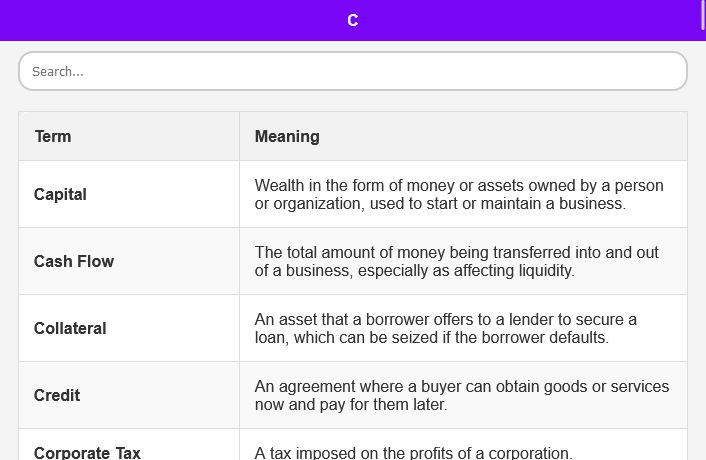 व्यापक संग्रह: सीधे ए-जेड प्रारूप में व्यवस्थित सैकड़ों वाणिज्य शब्दों का अन्वेषण करें। अब अप्रासंगिक जानकारी के पन्नों को छानने की जरूरत नहीं; आपको जो चाहिए वह तुरंत और कुशलता से ढूंढें।