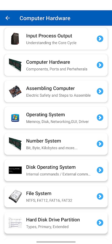 कंप्यूटर हार्डवेयर सीखें और कंप्यूटर नेटवर्किंग सीखें ऐप में शामिल सामग्री:
