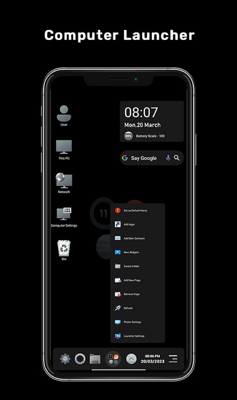 कंप्यूटर लॉन्चर एक एंड्रॉइड ऐप है जो अनुकूलन योग्य थीम, शॉर्टकट और विजेट के साथ आपके डिवाइस को डेस्कटॉप-शैली के इंटरफ़ेस में बदल देता है। यह आपके Android डिवाइस को एक पारंपरिक कंप्यूटर की तरह दिखने और महसूस करने के लिए डिज़ाइन किया गया है, जिसमें स्टार्ट मेनू, टास्कबार और डेस्कटॉप आइकन शामिल हैं।