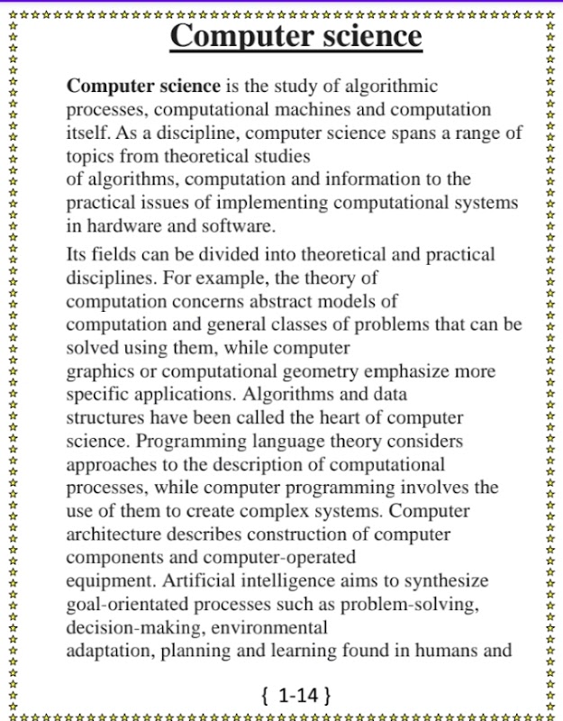 कंप्यूटर विज्ञान, कंप्यूटर और कंप्यूटिंग का अध्ययन, जिसमें उनके सैद्धांतिक और एल्गोरिथम नींव, हार्डवेयर और सॉफ़्टवेयर शामिल हैं, और प्रसंस्करण जानकारी के लिए उनके उपयोग शामिल हैं। कंप्यूटर विज्ञान के अनुशासन में एल्गोरिदम और डेटा संरचनाओं, कंप्यूटर और नेटवर्क डिज़ाइन, मॉडलिंग डेटा और सूचना प्रक्रियाओं और कृत्रिम बुद्धिमत्ता का अध्ययन शामिल है। कंप्यूटर विज्ञान गणित और इंजीनियरिंग से इसकी कुछ नींव खींचता है और इसलिए कतारबद्ध सिद्धांत, संभावना और सांख्यिकी, और इलेक्ट्रॉनिक सर्किट डिजाइन जैसे क्षेत्रों से तकनीकों को शामिल करता है। कंप्यूटर विज्ञान भी परिकल्पना, डिजाइन, माप, और नए एल्गोरिदम, सूचना संरचनाओं, और कंप्यूटर आर्किटेक्चर के शोधन के दौरान परिकल्पना परीक्षण और प्रयोग का भारी उपयोग करता है। कंप्यूटर विज्ञान MCQs (भाग 1,2,3) 900% MCQs for Test (NTS) , सीएसएस, पीएमएस आदि) तैयारी। कंप्यूटर मौलिक MCQs, कंप्यूटर MCQs, एमएस कार्यालय,