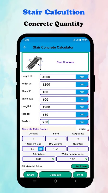 निम्नलिखित कार्यक्षमताओं के लिए कंक्रीट कैलकुलेटर: